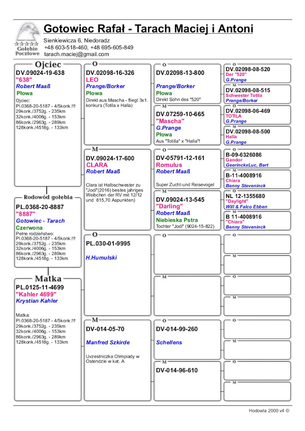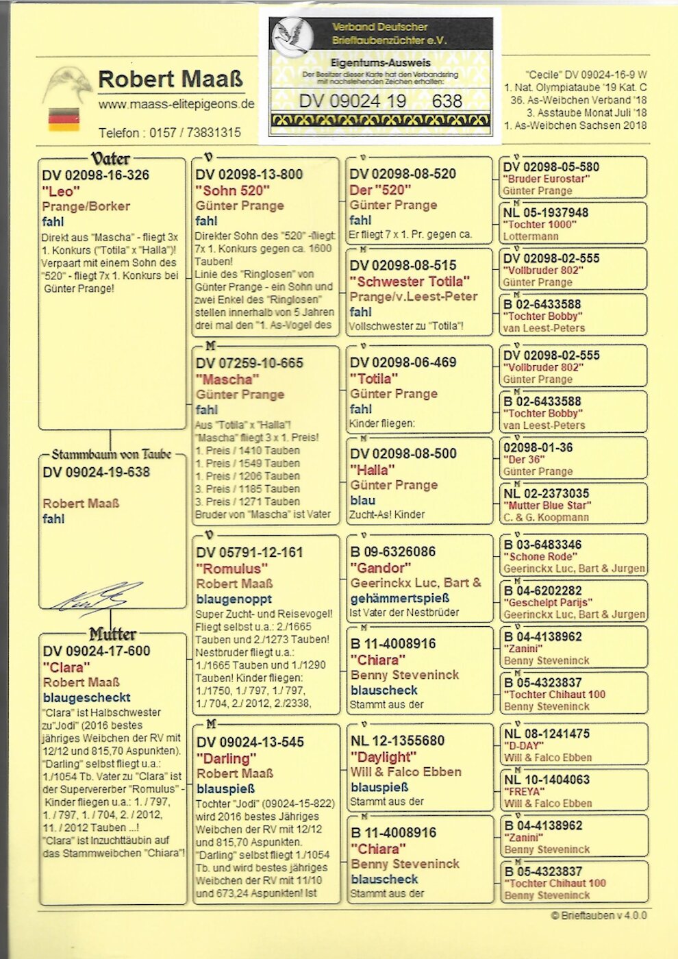 Ojciec: oryg Robert Maaß, śietny rozpłodowiec z super pochodzeniem (Prange/Borker, Maaß, Geerinckx, Steveninck, Ebben).
