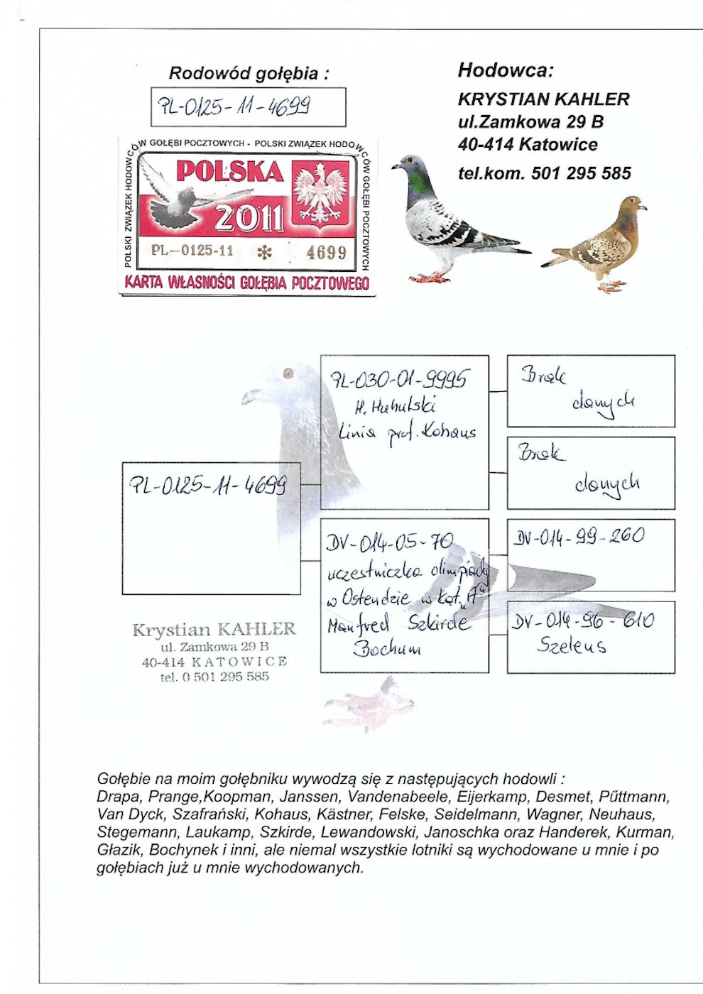 Matka: Krystian Kahler, oryginalny gołąb z hodowli żywej legendy sportu gołębiarskiego - Krystiana Kahlera, z linii olimpijki w kat A.