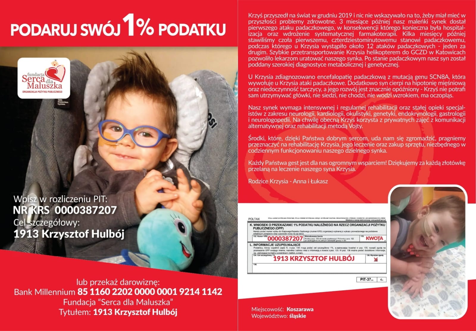 U Krzysia zdiagnozowano encefalopatie padaczkową z mutacją SCN8A, dodatkowo Krzyś cierpi na hipotomię mieśniowąoraz niedoczynnośc tarczycy. Wymaga ciągłęj intensywnej rehabilitacji.