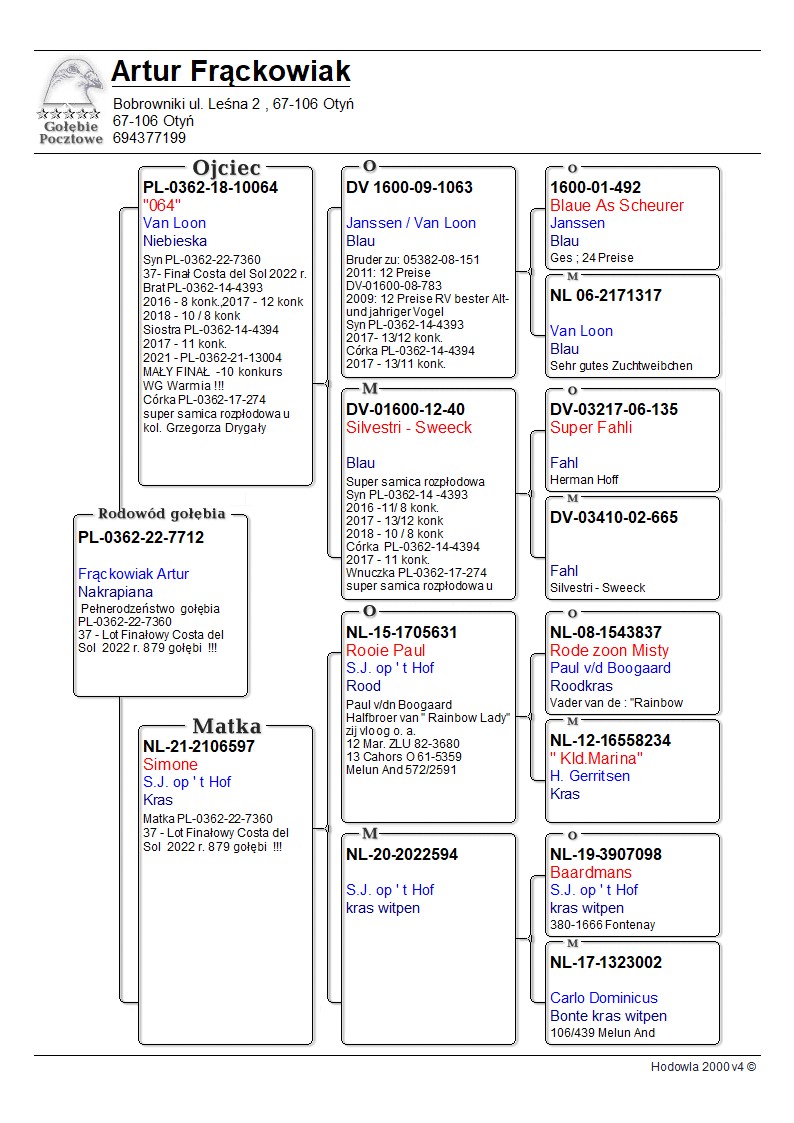 Posiadam gołębie z najlepszych niemieckich, belgijskich i holenderskich hodowli. Ze względu na pracę za granicą moją hodowlą opiekuje się rodzina. Pomimo mojej nieobecności gołębie i tak bardzo dobrze radzą sobie w rywalizacji z innymi hodowcami, co pokazuje, że są na prawdę wartościowe. Największe sukcesy lotowe, jakie odnosiłem w ostatnim czasie, to bardzo dobre wyniki na zawodach typu wspólny gołębnik. Rywalizacja z topowymi hodowcami na szczeblu naszego kraju, a także całej Europy to nie lada wyzwanie, tym bardziej że na wspólne gołębniki każdy wysyła swoje najlepsze gołębie. Zajmując czołowe lokaty, a szczególnie wygrywając loty konkursowe utwierdzam się w przekonaniu, że posiadane przeze mnie gołębie są naprawdę wysokiej jakości, ale ze względu na nadwyżkę hodowlaną chciałbym część z nich sprzedać. Jestem pewien, że ich nowi właściciele będa mieli z nich tyle samo radości i powodów do dumy, co ja.