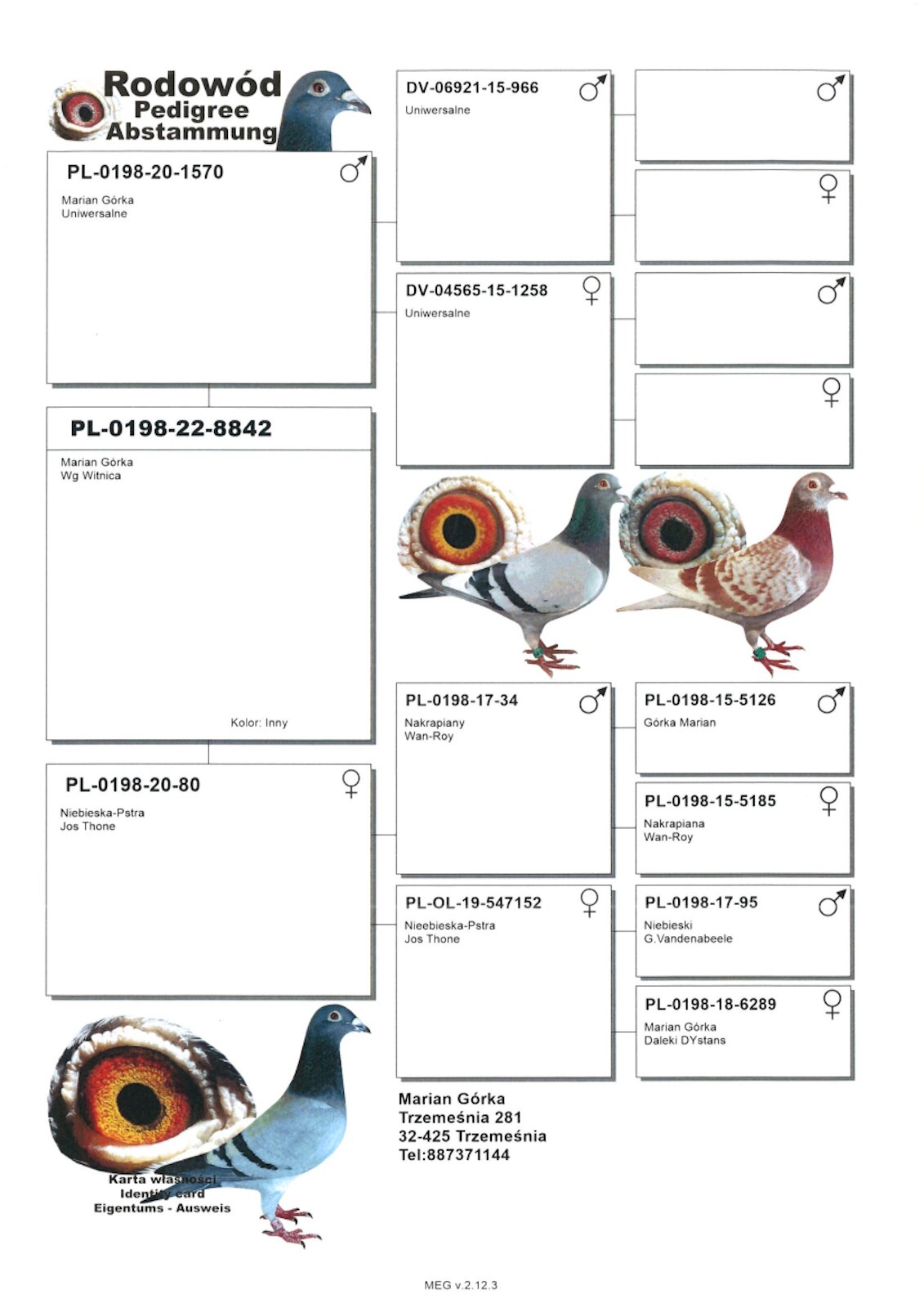 PL-0198-22-8842: Gorka Marian, 62 Lotnik min 81m, 44m, 79m Gołąb z hodowli: Gorka Marian