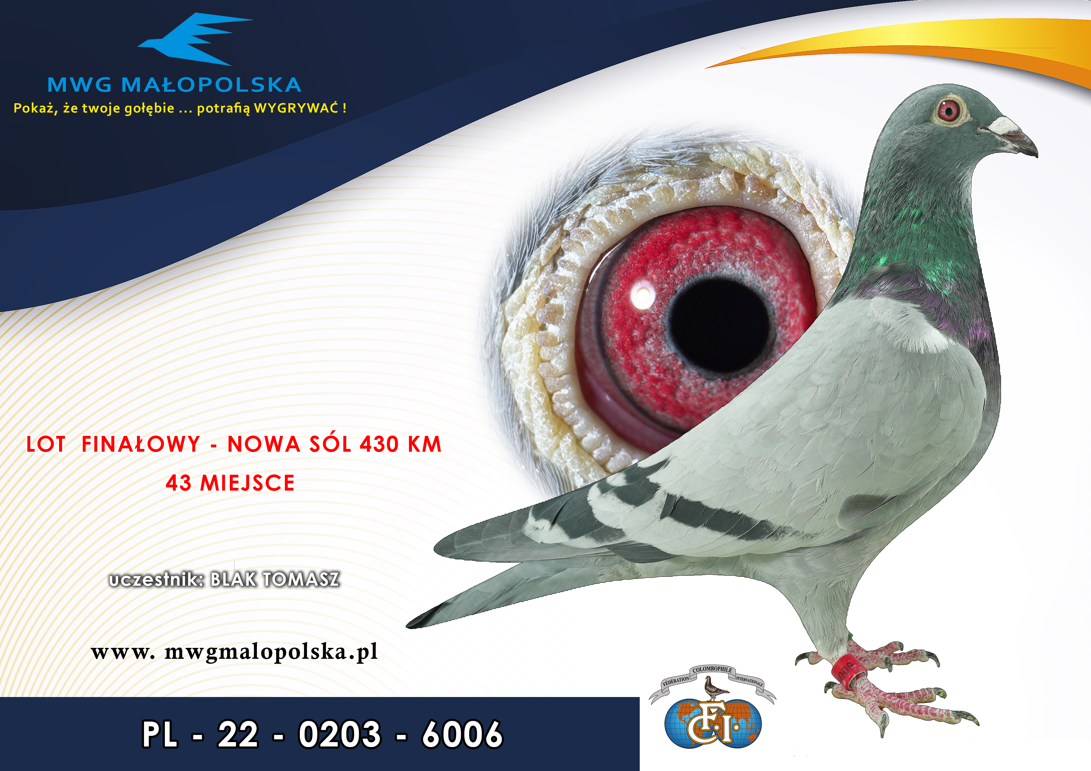 PL 0203 22 6006– org. Blak Tomasz - 15 AS _Gołąb na 1500 przyjętych gołębi - 43m – Finał 430km!!!, 5m - 3 wyścig!!!, na finale zameldował się przy wieczornej porze!!! o godz: 19:52 !!! - super charakter !!! (prawdopodobnie samczyk)