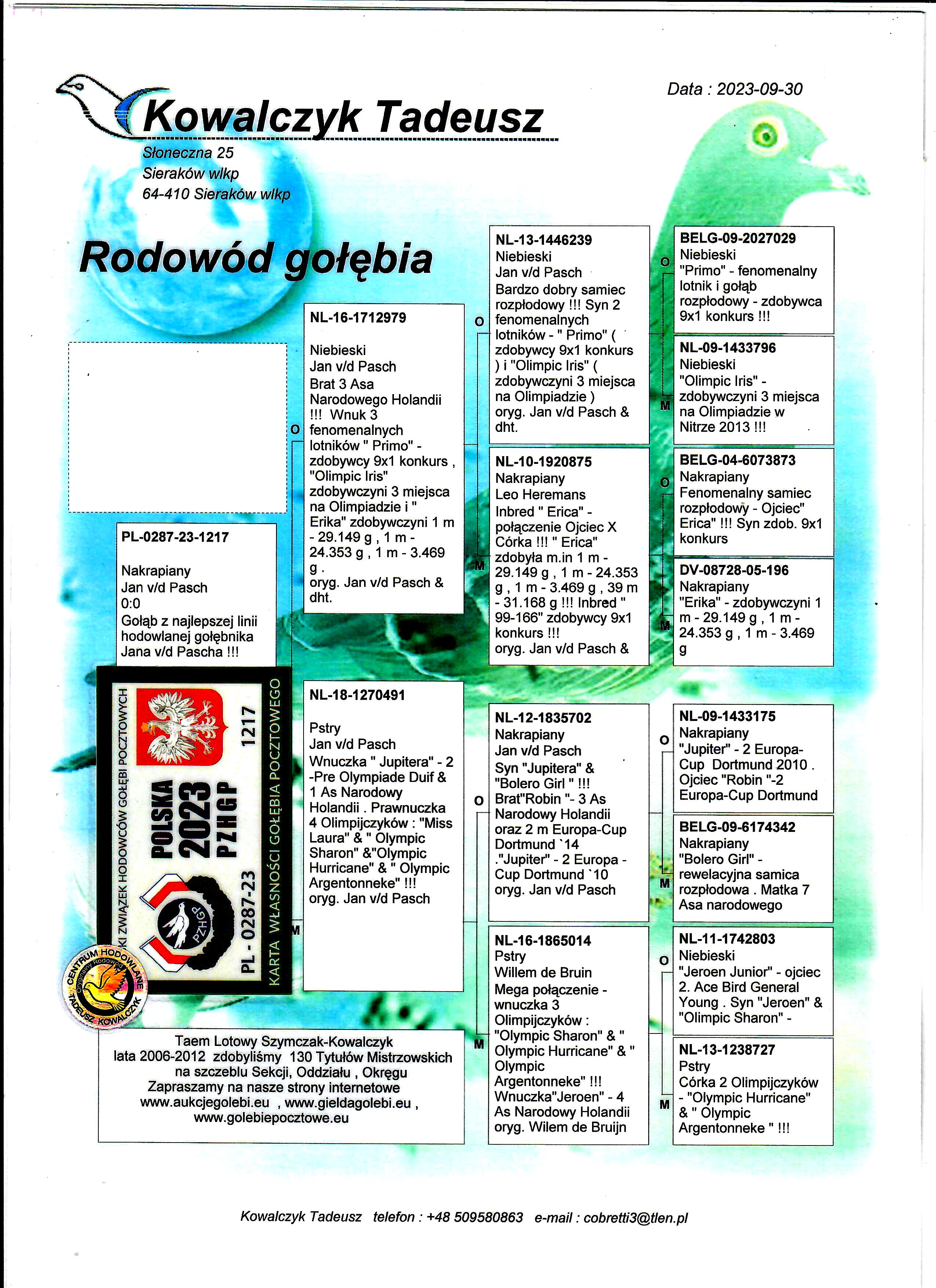 PL-0287-23-1217 Unikat- Linia bazowa hodowli Jan v/d Pasch