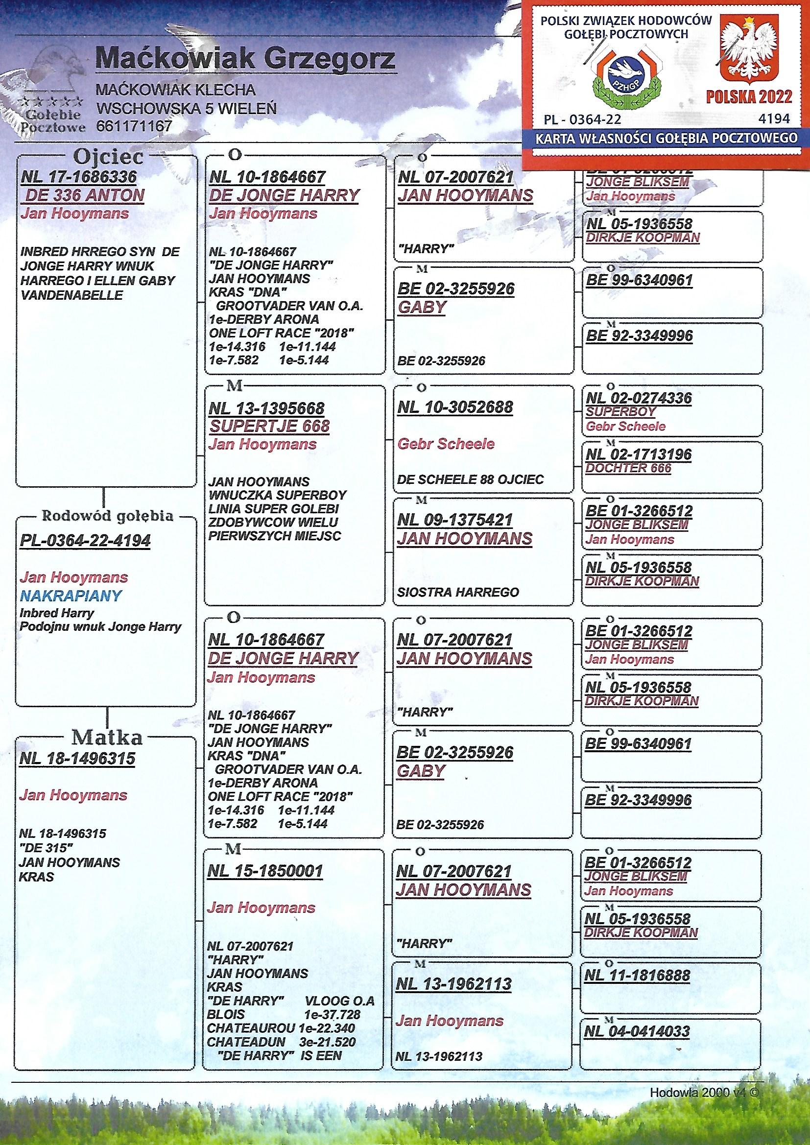 PL-0364-22-4194 Inbred Jan Hooymans podwojny wnuk Jonge Harry jeden z najepszych synow Harrego