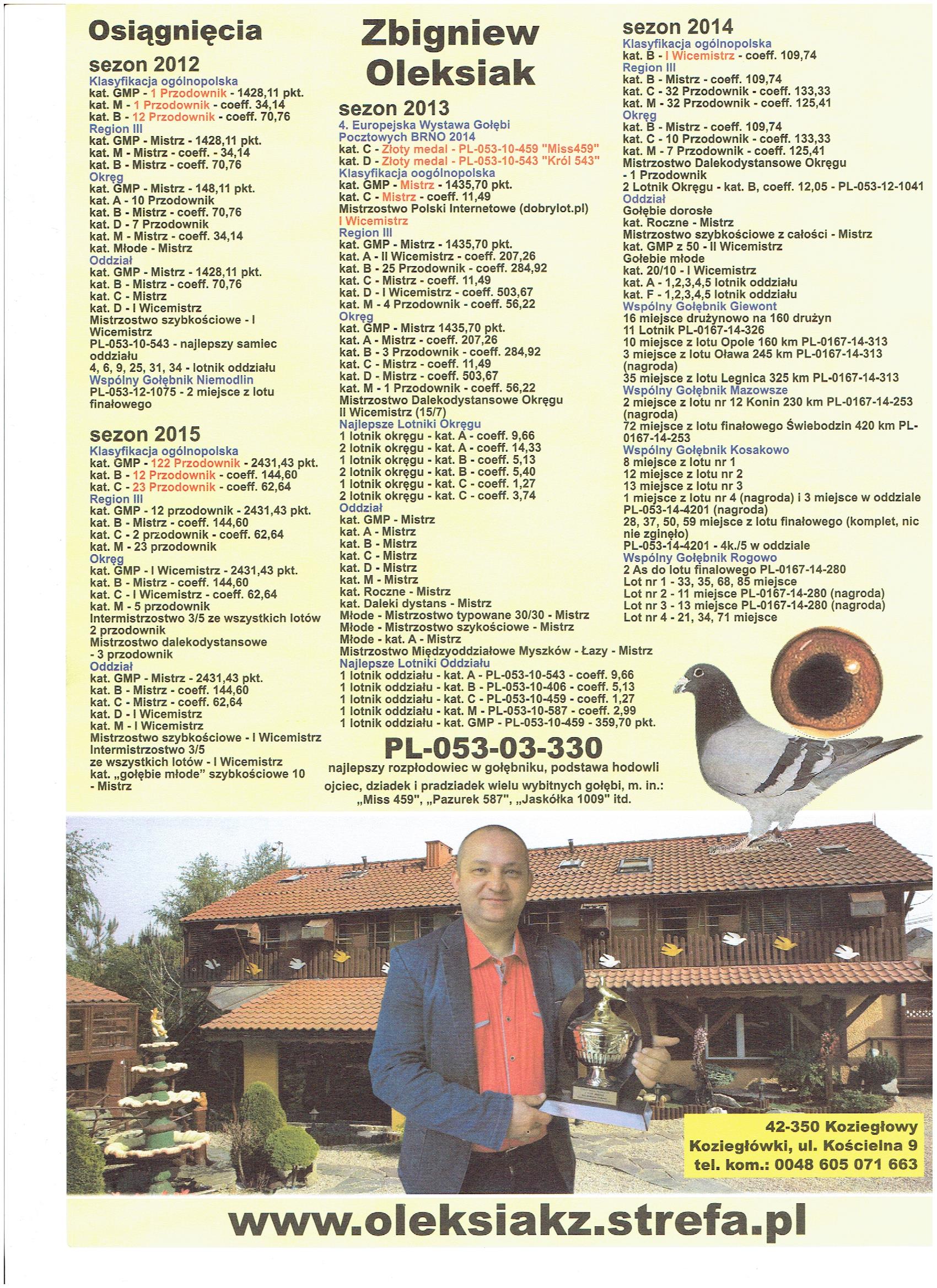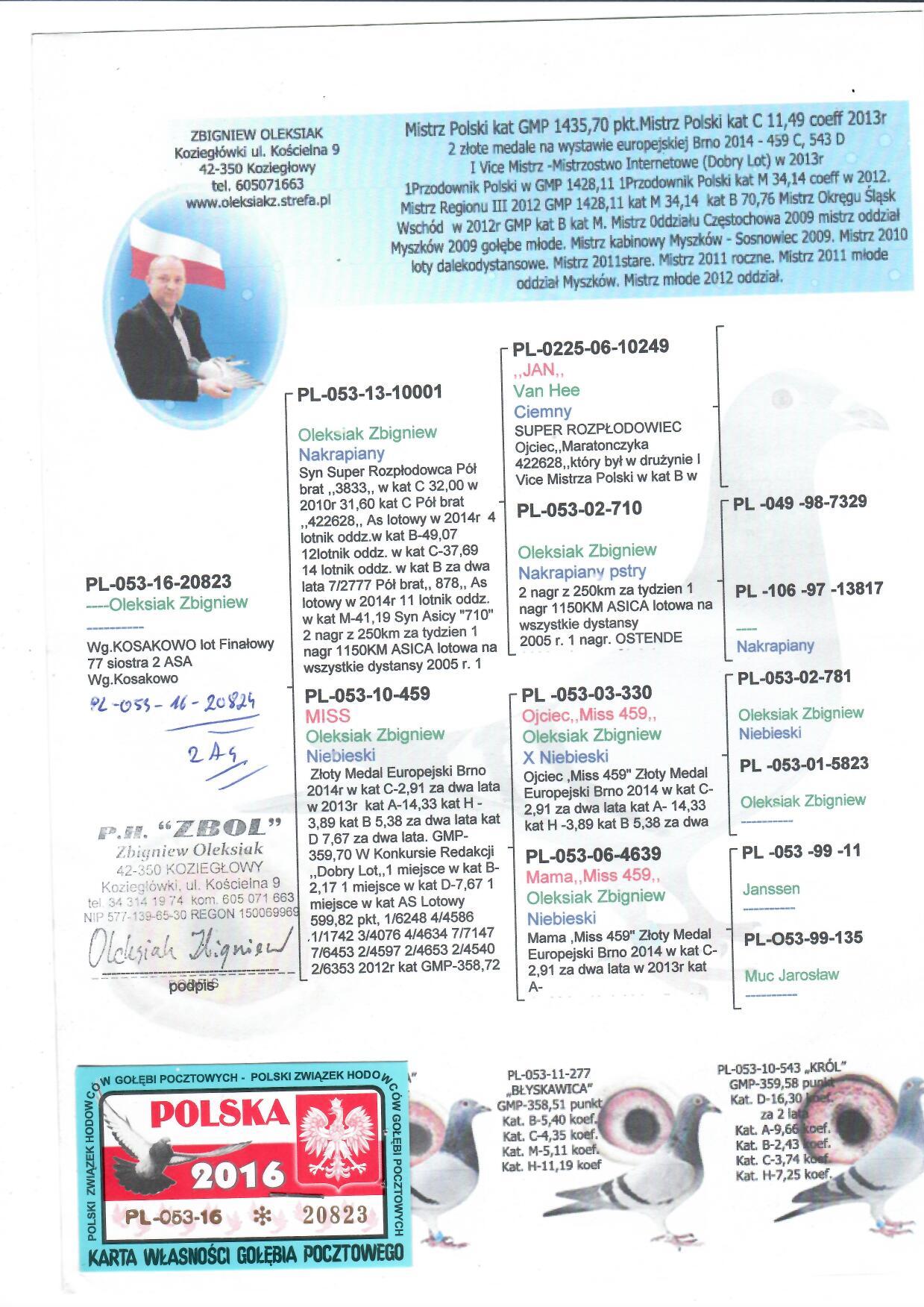 PL-053-16-20823 oryg Zbigniew Oleksiak mega samiec Syn najsłynniejszego gołebia Zbyszka - MISS 459